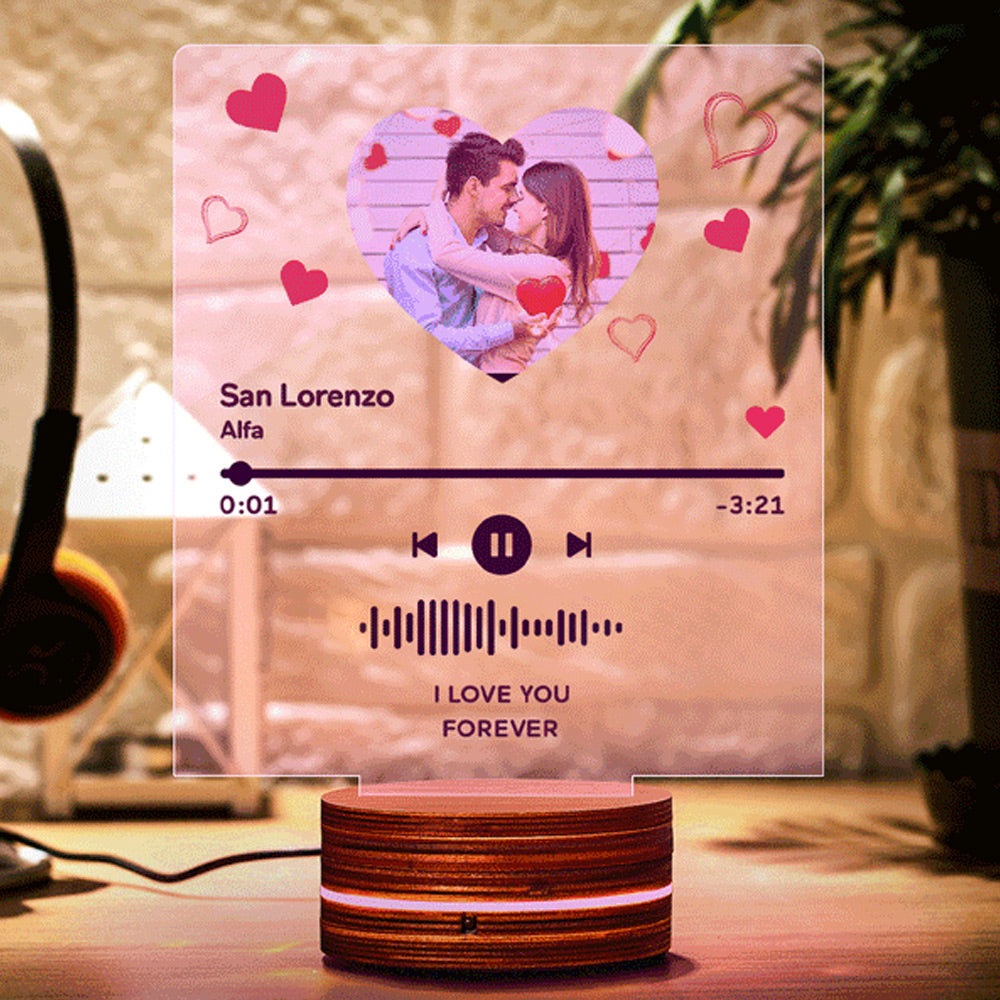 Customize your favorite pictures, song title, artist name on the acrylic plaque,  and you can generate a unique Spotify code. Please note that the acrylic plaque itself does not emit music. You have to scan the code on the app, after scanning the code on Spotify, your song will start playing immediately. The night light will become the most unique decoration in the room, it is also the best perfect gift for friends, family, couple.