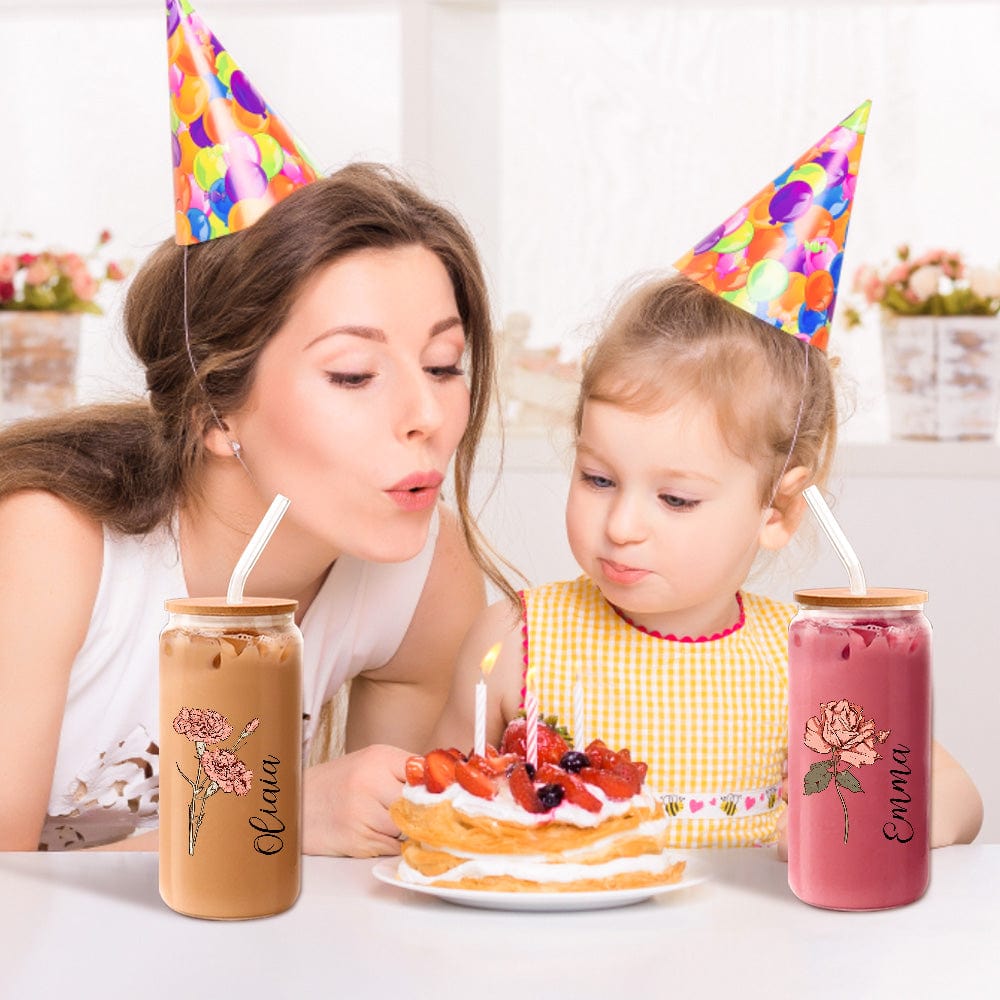Personalized Name Can Glass with Colorful Birth Flower Custom Can Glass with Straw Gift for Mother Friends Family Bridesmaid