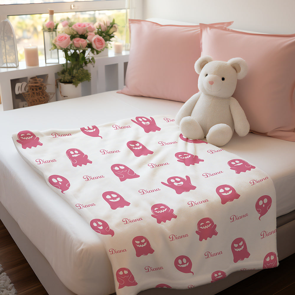 Personalized Name Spooky Ghost Pattern Blanket – Custom Name Engraving Halloween Gift