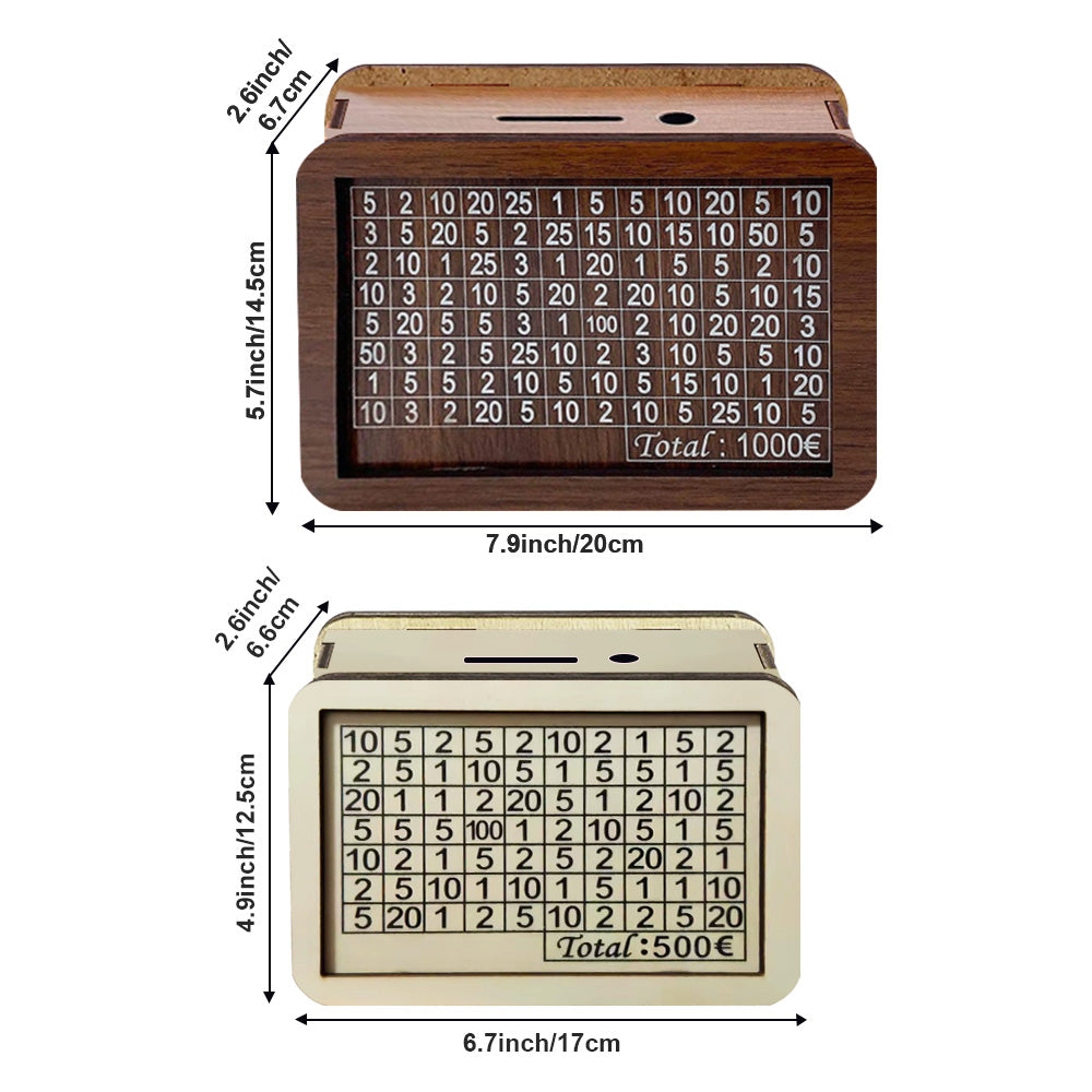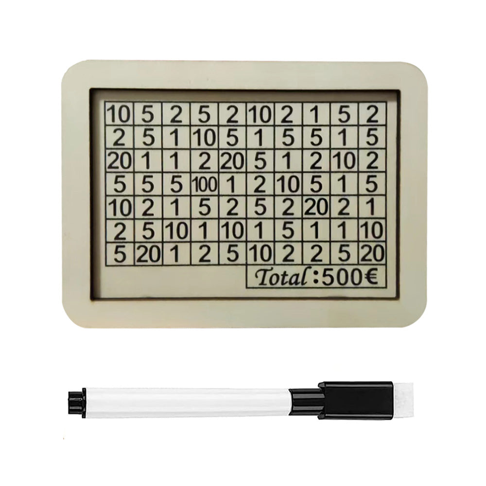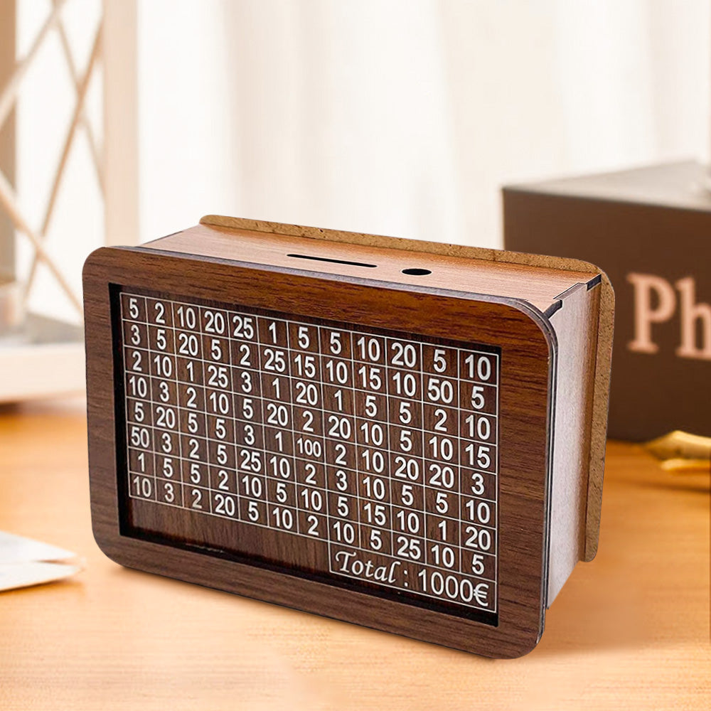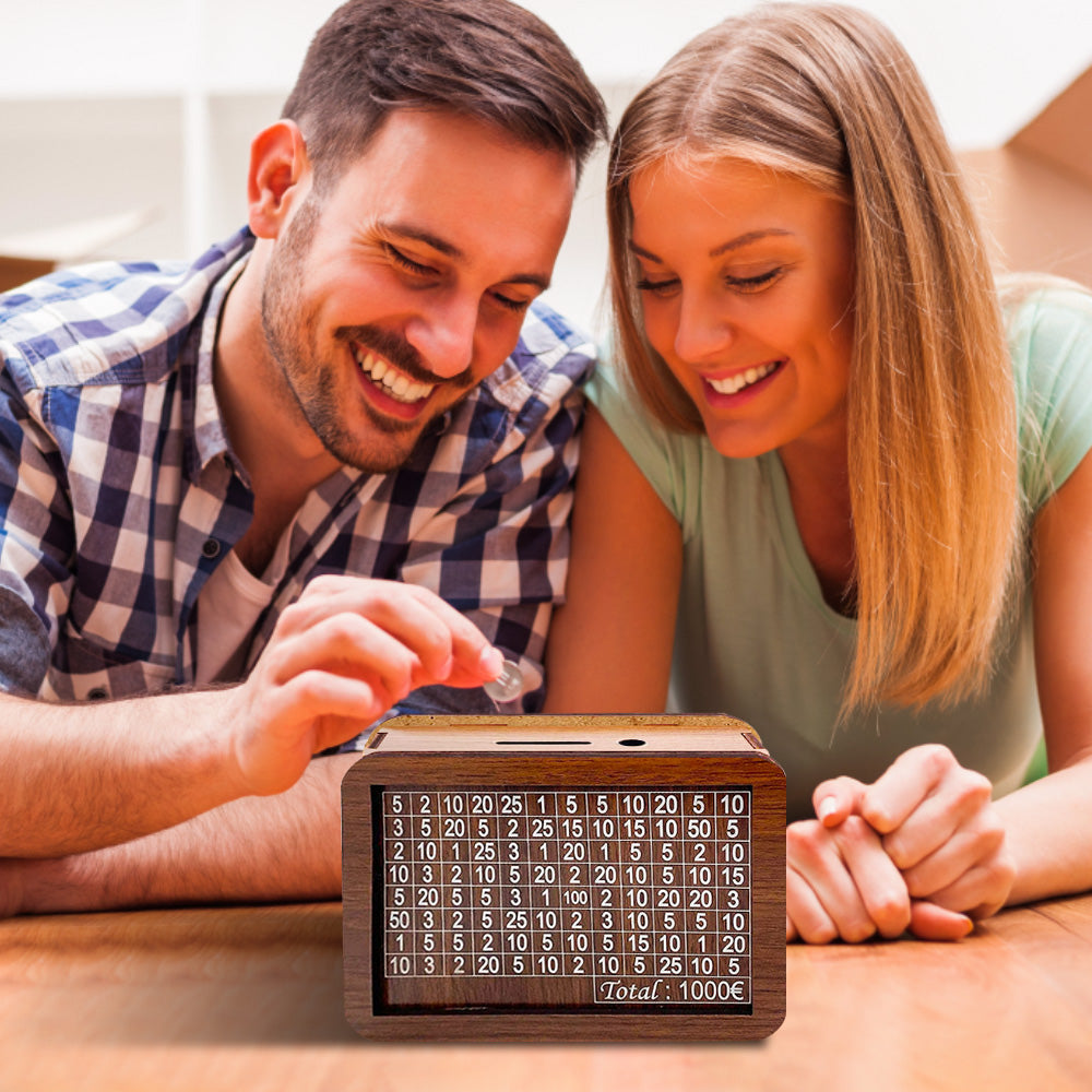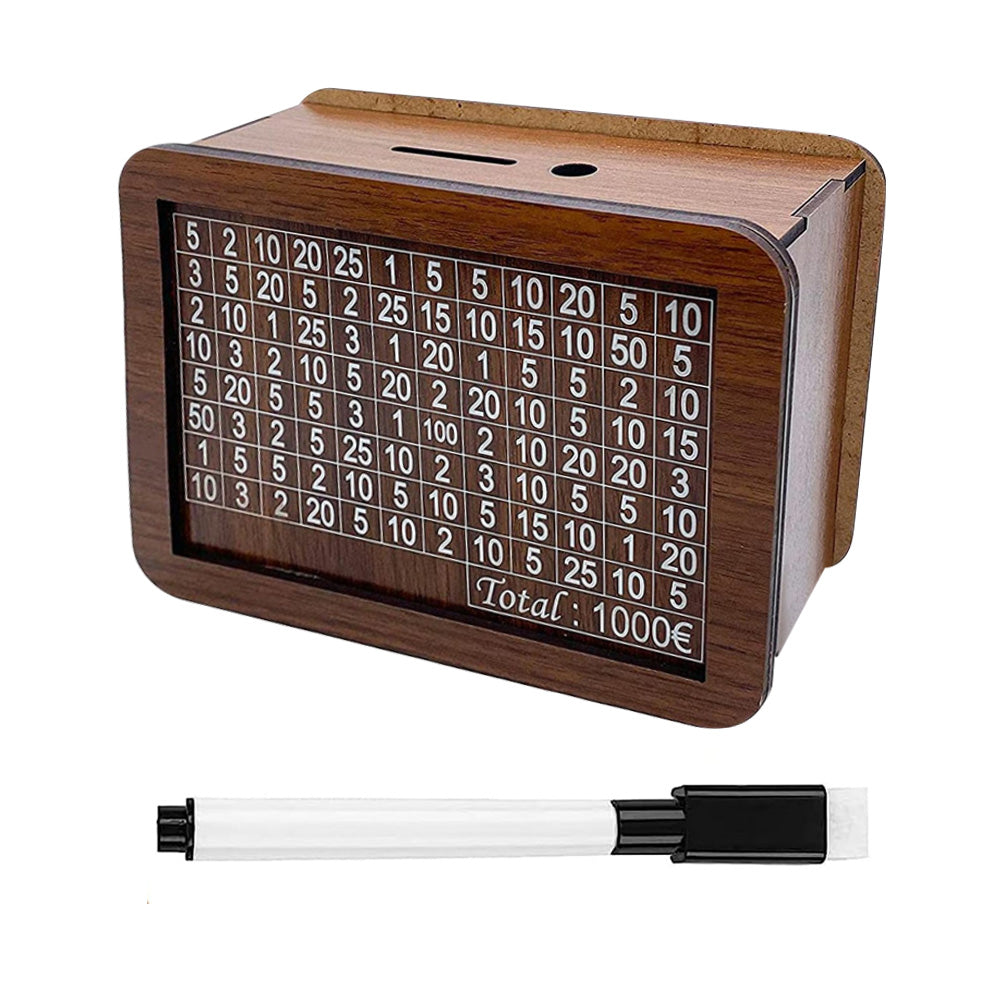 The money box assembly is very simple, can be installed in a few minutes by simply splicing the appropriate holes and then use, saving has never been so easy and is even fun! The surface of the money box is printed with different numbers to achieve the target of €1000, you must pay the amount printed on the box and tick the amount.