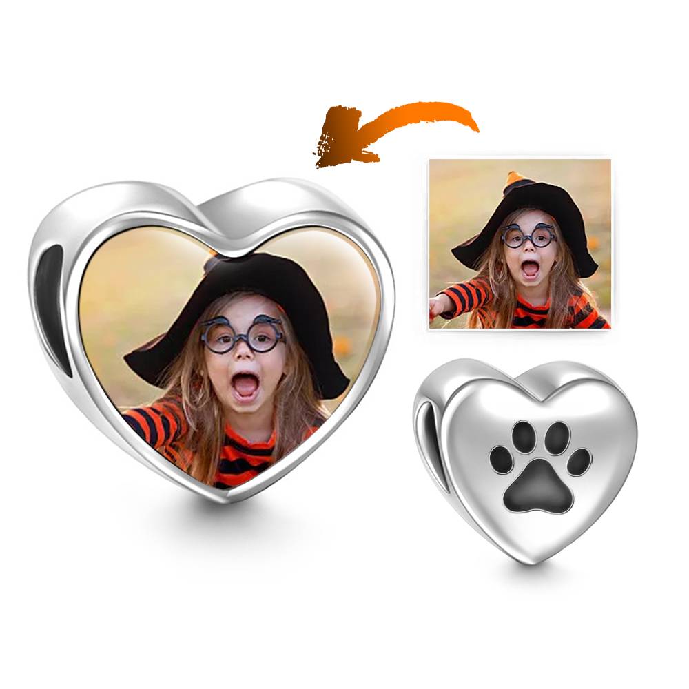 Paw Print Custom Heart Photo Charm Bead Pendant Silver
