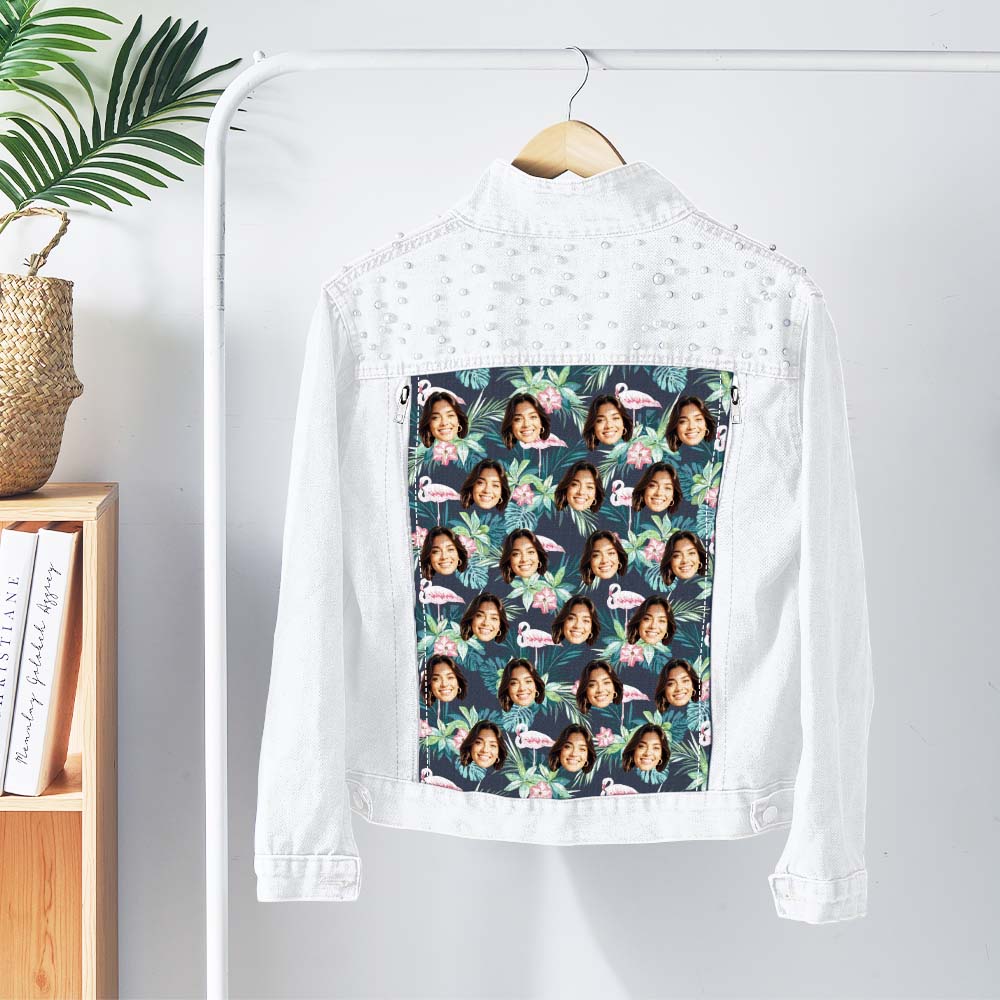 Personalized Jean Jacket with Pearl Custom Face Leaf Printing Denim Jacket Funny Gift for Her