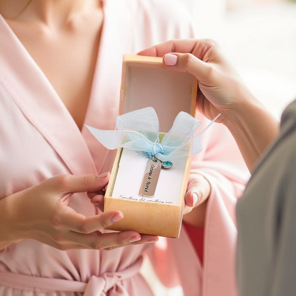 Our Personalized Bridal Bouquet Charm is a beautiful addition to any bride's bouquet, with its delicate engraving and "Something Blue" card. This charming gift is a perfect way to add a personal touch to your wedding, and it's sure to be a cherished keepsake for years to come.
